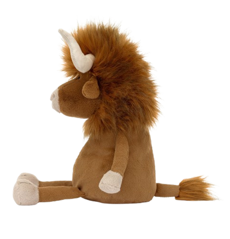 This is a Ramone Bull by Jellycat. This bull has a brown body, with reddish fur on the head and tail, and has white hooves, nose, and horns. This is a great gift to give your child or someone who loves cute cuddly things.