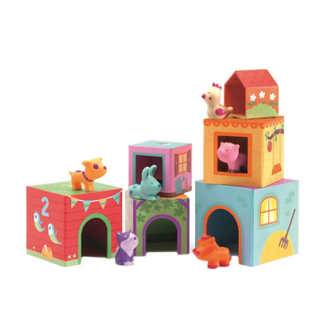 The Topanifarm colorful cardboard blocks feature cut-out doors and beautiful illustrations of homes of different farm animals. Learn matching stacking and counting with this fun set of blocks. Pile the blocks high or set them in a row. Count along with the numbers on the side of the blocks. Place each animal in their correct home or just play with the animals themselves. Little ones will use their imagination, motor skills and learn with this fun set of blocks.
